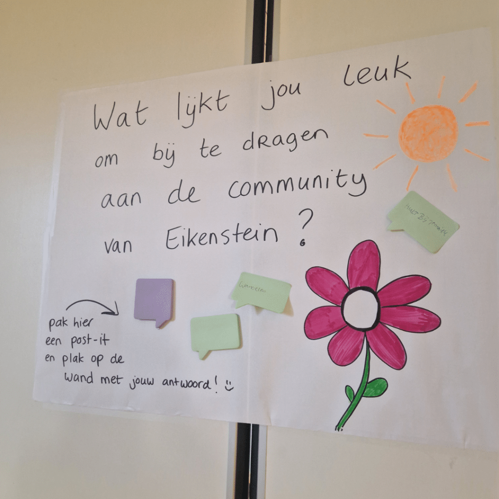 Wat Eikenstein bijzonder maakt, wordt tijdens de middag al zichtbaar. De nieuwe bewoners denken samen na over wat zij straks voor elkaar kunnen betekenen. Ideeën als boodschappen doen, helpen met schoonmaken, samen koken, tuinieren of spelletjes doen, komen spontaan naar voren. “Je woont samen en naast elkaar. Je vormt een gemeenschap,” benadrukt regiomanager Ageeth Wildeman. “Bewoners doen zoveel mogelijk zelf, maar kijken ook naar elkaar om. Iedereen draagt iets bij, hoe klein ook. Begeleiders ondersteunen waar nodig en stimuleren eigen regie.”